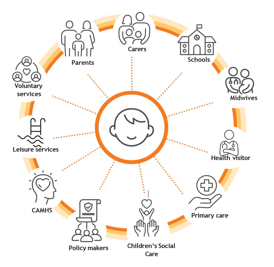 The picture shows how different adults and services in Sefton are connected to each child working together to give them the best chance at emotional wellbeing. No single person or group is blamed; instead, everyone plays a part. These include: